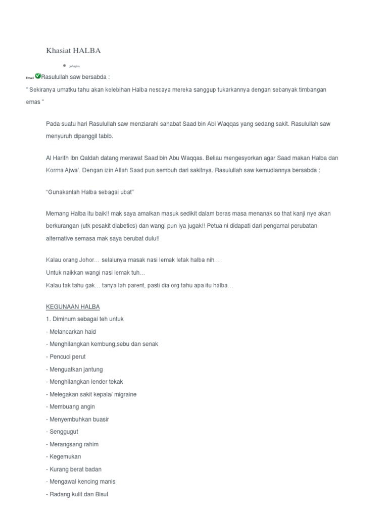 Antara kelebihan & khasiat teh halba dari kajian perubatan. Halba atau biji halba adalah sejenis rempah ratus atau herba yang lazimnya digunakan untuk memasak kari dan sebagainya. Khasiat scrub halba untuk kulit wajah.halba dalam diet harian mampu menurunkan kadar glukosa darah pada pesakit kencing manis. Digunakan secara rawatan tradisional untuk meransang metabolisma & membantu membersihkan darah. Khasiat halba untuk diabetes / kencing manis 5.