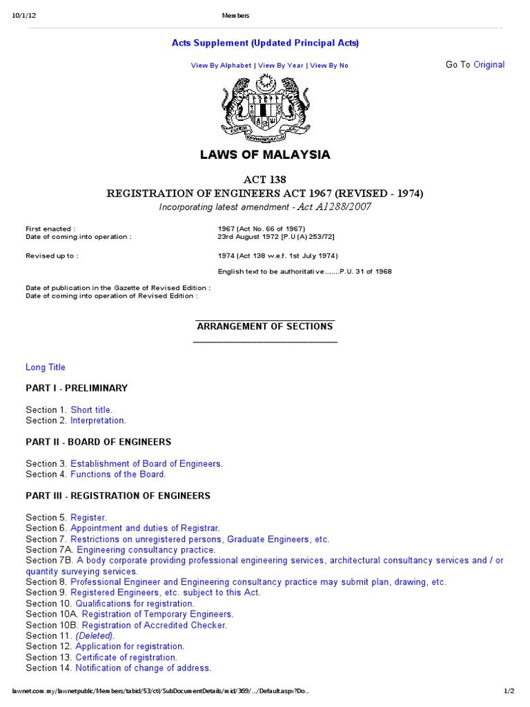 Seksyen 24a (1), akta pendaftaran jurutera 1967 no person shall employ a person, sole proprietorship, partnership or body corporate, other than a registered engineer or an engineering consultancy practice, to perform professional engineering services Holdings akta pendaftaran jurutera 1967 akta 138 dan peraturan peraturan dan registration of engineers act 1967 act 138 and regulations hingga 10hb november 1999 Subject to this act, the following persons shall be entitled on application to be registered as professional engineers: & registration of engineers act (act ) and regulations: (1) akta ini bolehlah dinamakan akta pendaftaran jurutera (pindaan) 2014.