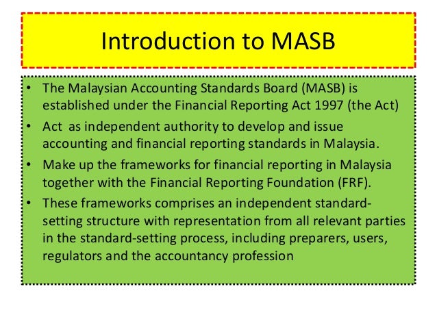 The malaysian accounting standards board launched the malaysian private entities reporting standards (mpers) on 27 october 2015. P1 the malaysian accounting standards board (masb) and the financial reporting foundation (frf) were established under the financial reporting act 1997 (the fra). P2 by virtue of section 7 of the fra, it is the function of the masb to issue accounting standards for financial statements that are required to be prepared The act was gazetted on 6 march 1997. The masb, together with the financial reporting foundation (frf), make up the new framework for financial reporting in malaysia.